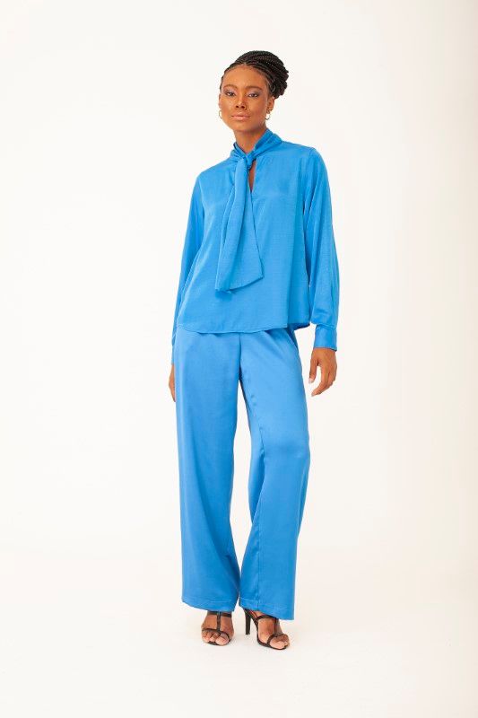 Blusa feminina em cetim leve e sofisticado, confeccionada em 51% poliéster e 49% viscose, proporcionando brilho elegante, toque suave e caimento fluido.