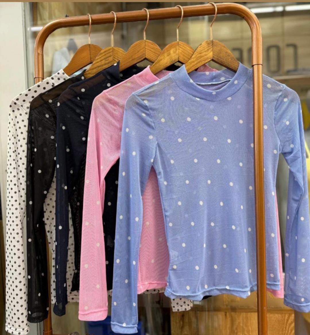 Delicada e versátil, a blusa em tule com estampa de poá é perfeita para compor looks modernos e cheios de estilo. Confeccionada em tecido leve e levemente transparente, possui modelagem justa, mangas longas e gola alta, garantindo um visual elegante e feminino.
