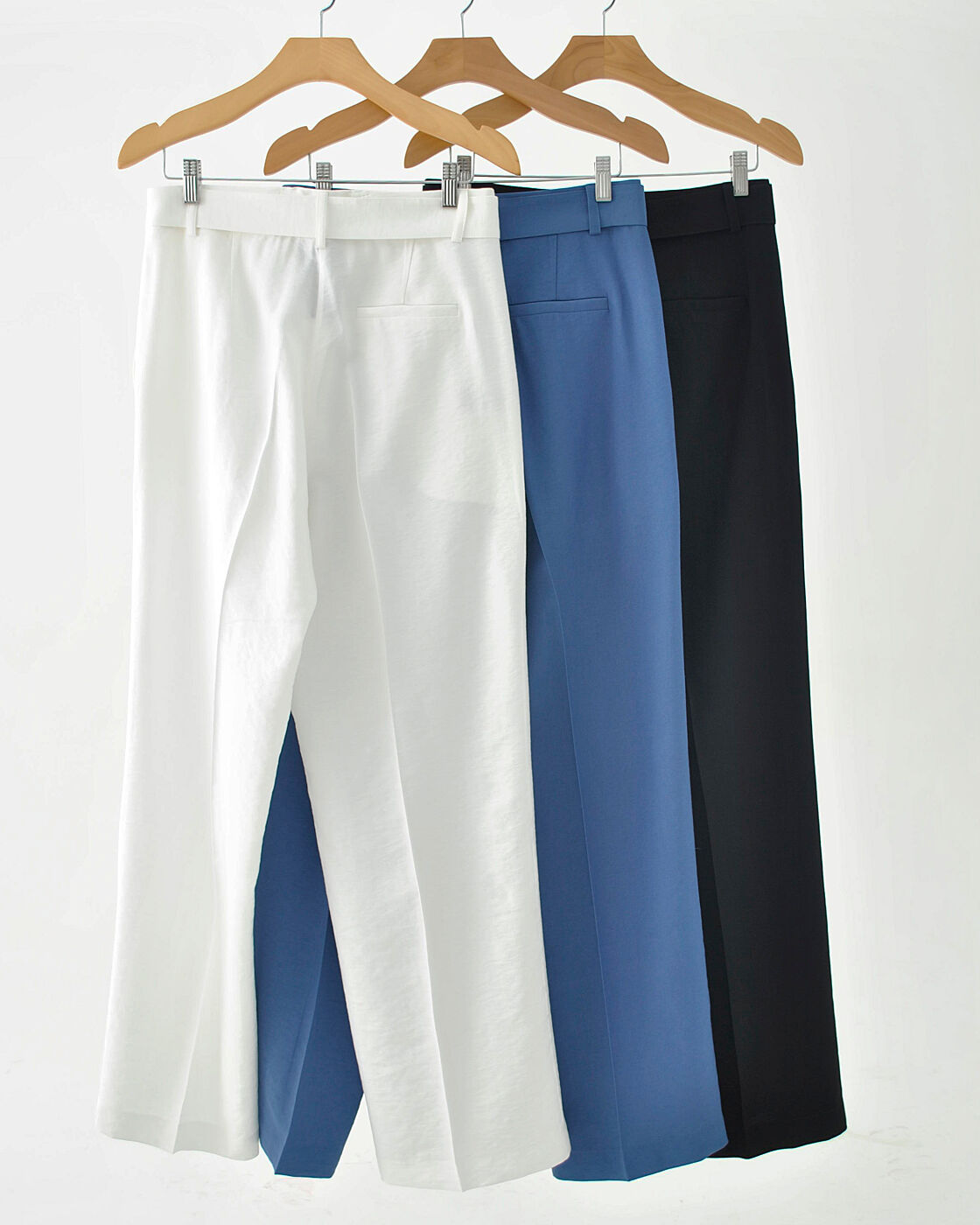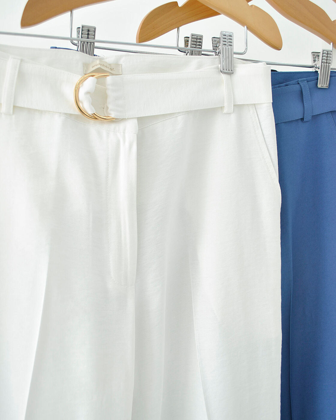 Calça reta em tecido encorpado e fluido. Possui cintura alta e fecho frontal. Cós com passantes, acompanha cinto no mesmo tecido. Bolsos frontal. Modelagem solta e caimento reto, veste bem para todos os biotipos femininos.
