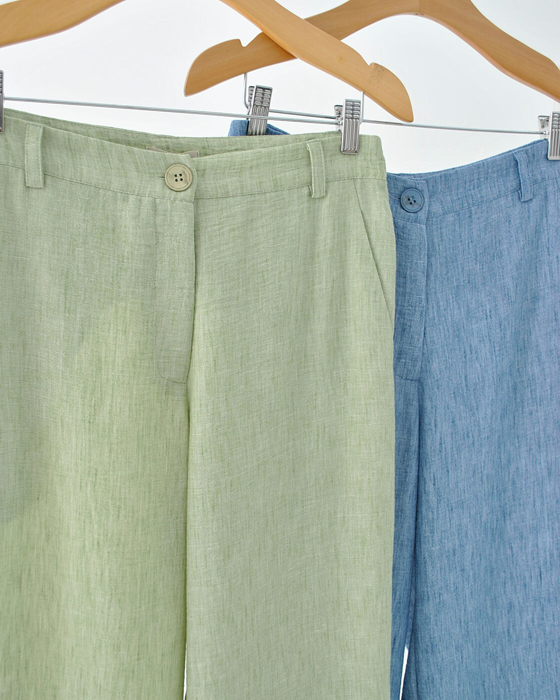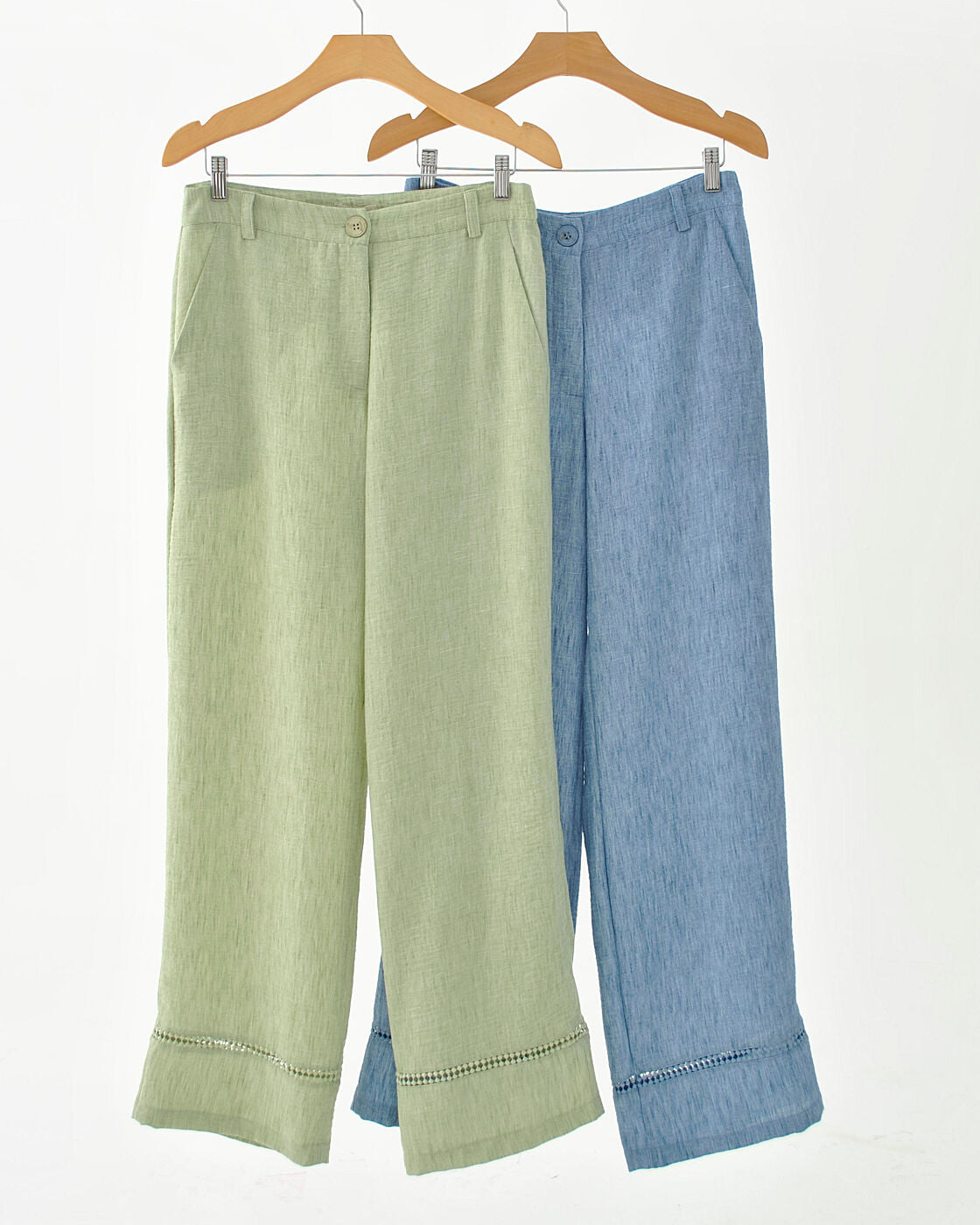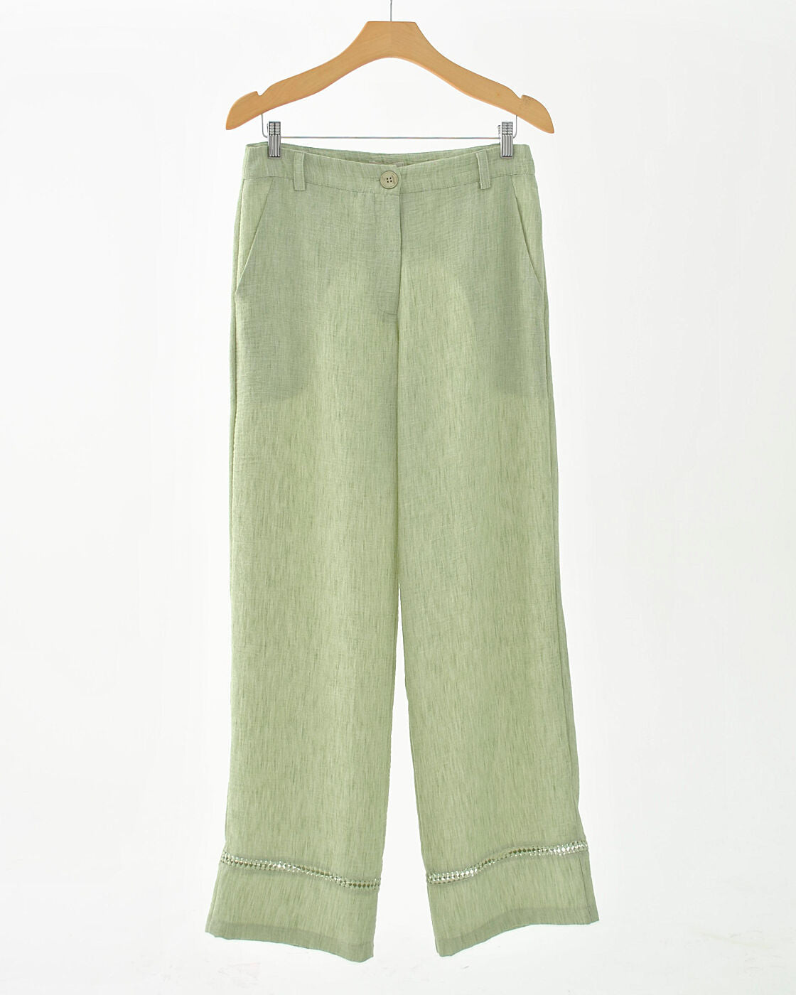 Calça reta em tecido texturizado e caimento fluido. Possui cintura alta e fecho frontal. Cós com passantes. Bolsos faca. Detalhe de renda aplicado na barra dão charme e delicadeza à peça. Shape solto e caimento reto, veste bem para todos os biotipos.