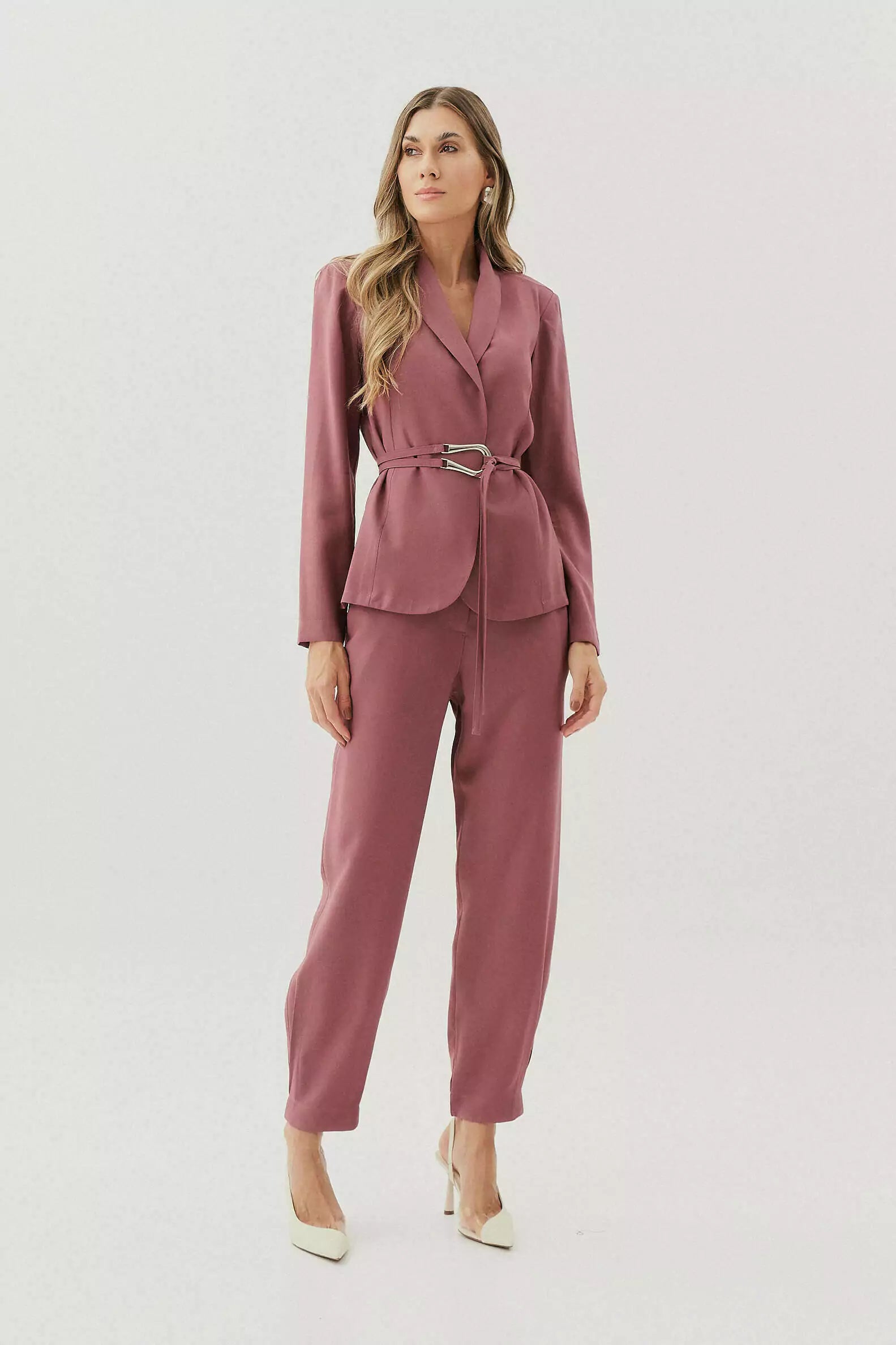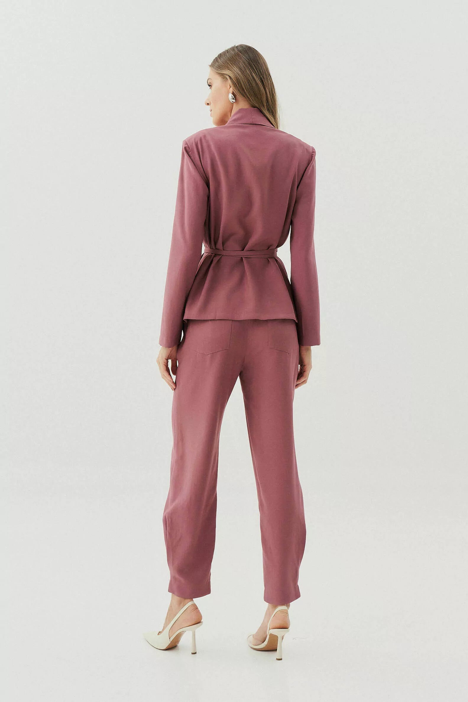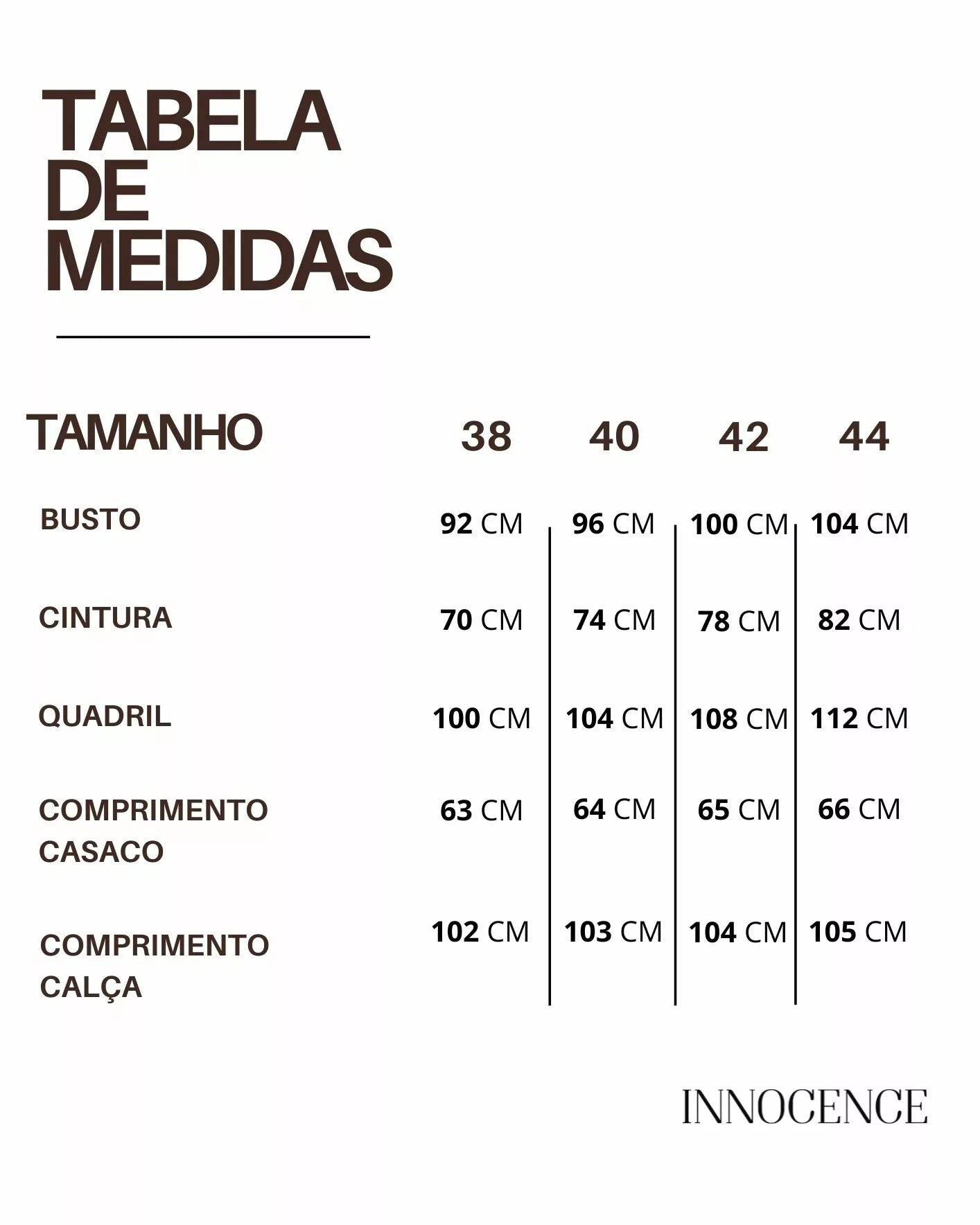 Conjunto alfaiataria viscose, blazer com tira de metal para fechamento. Calça reta, bolso nas laterais, bolso quadrado costas.92% Viscose 8% Poliéster