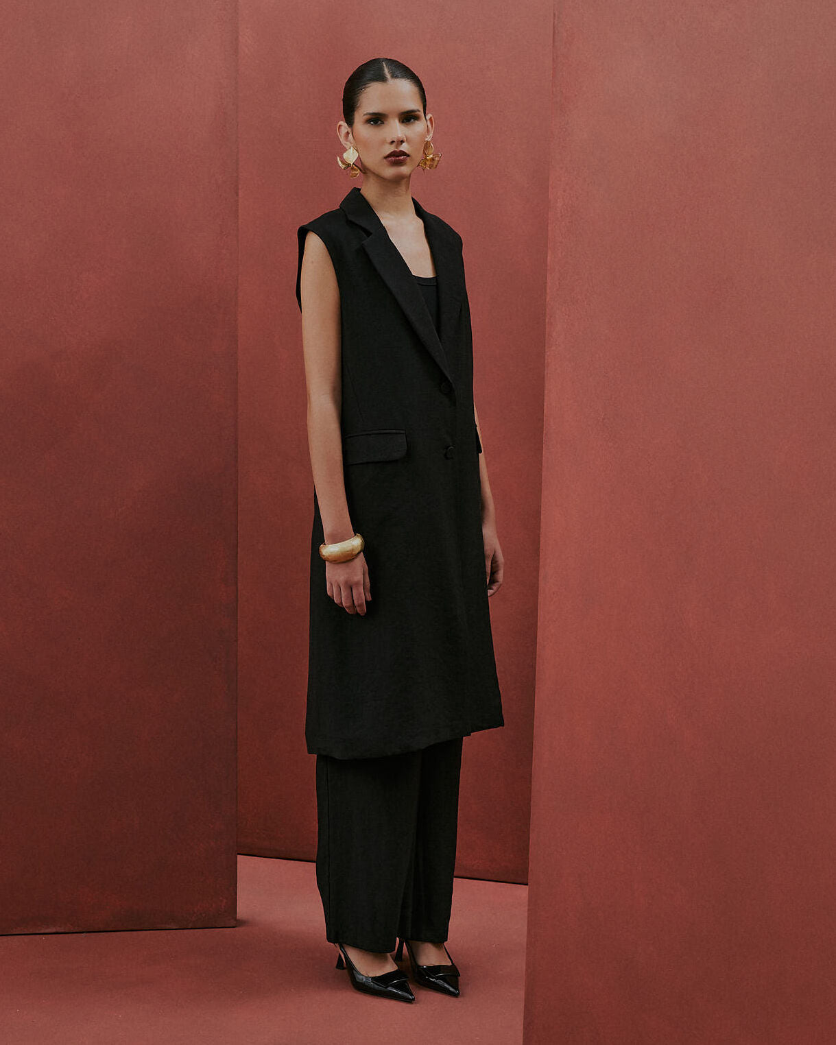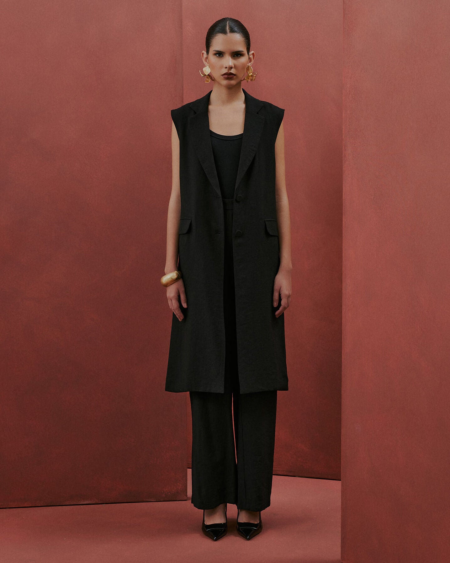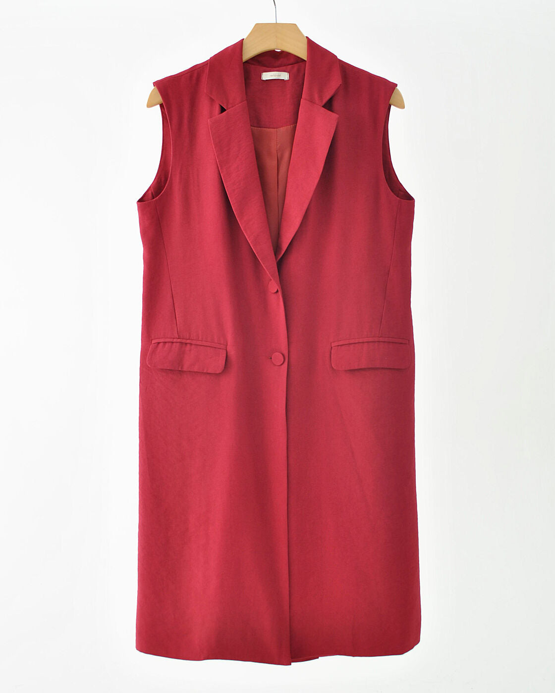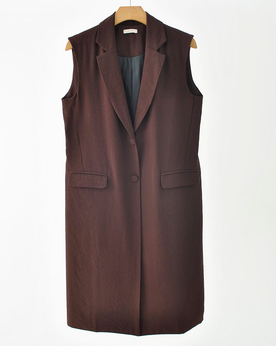 Max colete em alfaiataria, com modelagem reta e gola lapela. Possui dois botões frontais e bolsos decorativos com abas. Peça versátil, ideal para compor looks modernos e elegantes.