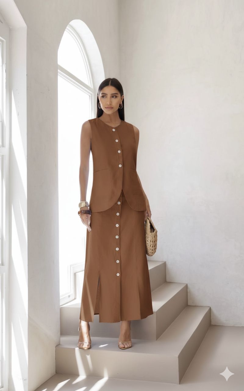 Saia longa feminina com caimento fluido e design elegante. Possui fechamento frontal por botões e fenda discreta, que garante conforto e liberdade de movimento. A modelagem valoriza a silhueta de forma delicada, tornando a peça versátil para composições sofisticadas ou produções casuais mais refinadas. Ideal para quem busca elegância e praticidade em uma única peça.