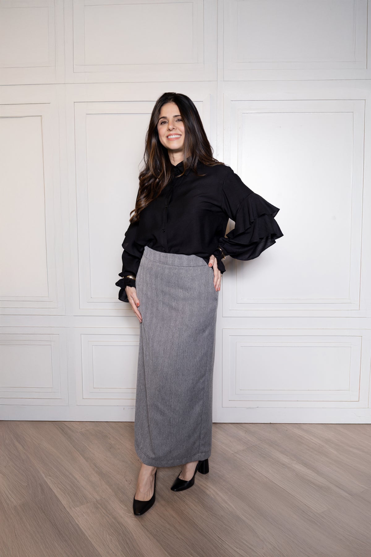 Esta saia longa em alfaiataria é a escolha ideal para quem busca elegância e versatilidade no dia a dia. Com modelagem reta e cintura alta, ela valoriza a silhueta de forma discreta e refinada. O tom cinza mescla confere um ar clássico, fácil de combinar com camisas, blusas e blazers.