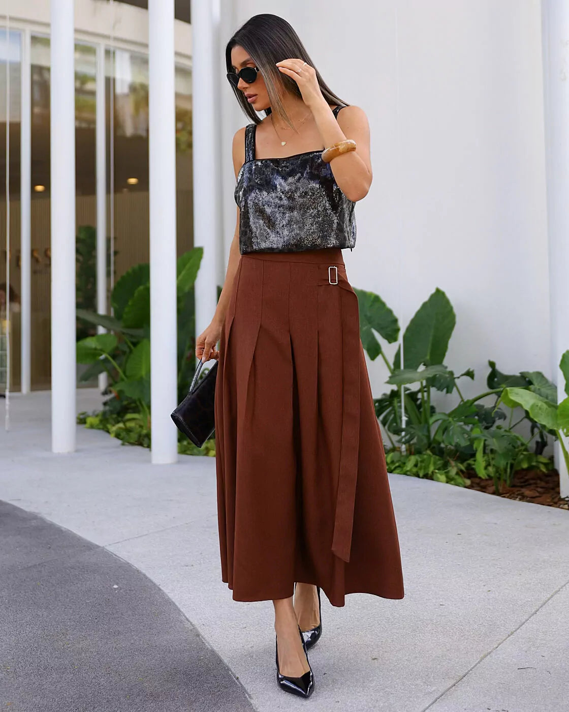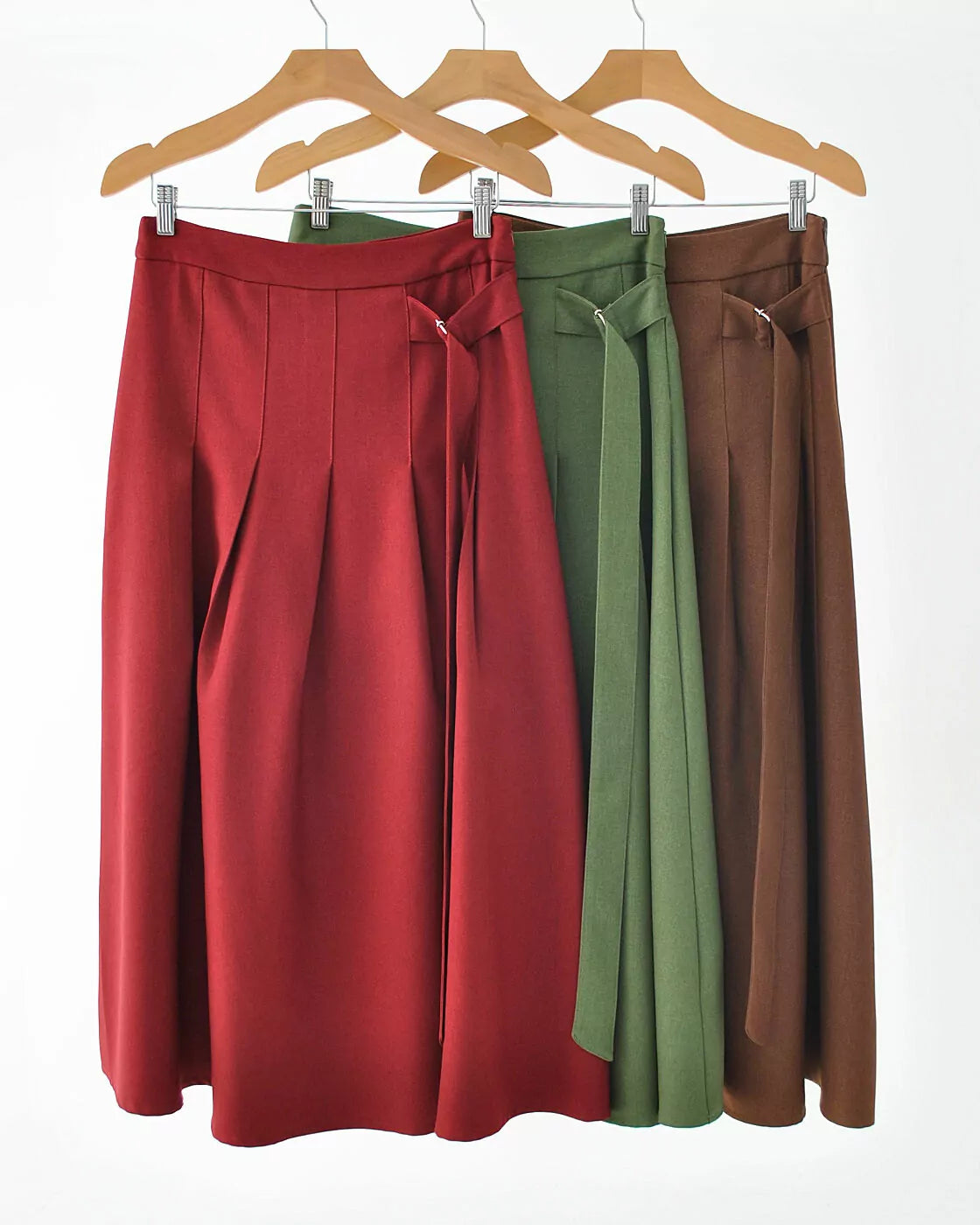 Saia midi de alfaiataria em tecido estruturado e macio. Possui cintura alta. fecho lateral com zíper e martigale aplicado. Possui pregas trazendo um belo movimento à peça. Modelagem evasê, valoriza todos os biotipos.100% POLIESTER