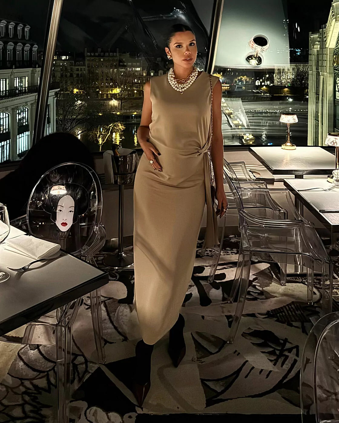 Vestido midi em tecido encorpado e caimento fluido. Possui gola redonda, sem mangas. Detalhe de godê lateral e nó valorizando a cintura. Modelagem alinhada no corpo com fenda inferior. Estilo clássico, elegante para diversas ocasiões.100% POLIESTER